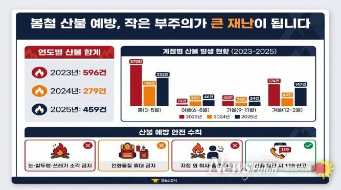 이에 따라 소방서는 △논·밭두렁 및 쓰레기 소각 금지 △입산 시 인화물질 휴대 금지 △지정된 장소 외 취사·흡연 금지 △산불 발견 시 즉시 119 신고 등 기본 안전수칙 준수를 강조했다.