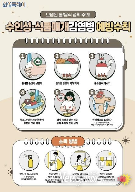 주요 예방수칙은 ▲흐르는 물에 비누로 30초 이상 손 씻기 ▲음식은 충분히 익혀 먹기 ▲물은 끓여 마시기 ▲채소와 과일은 깨끗이 씻어 섭취하기 ▲설사 증상 시 음식 조리 금지 ▲조리기구 구분 사용 등이다.