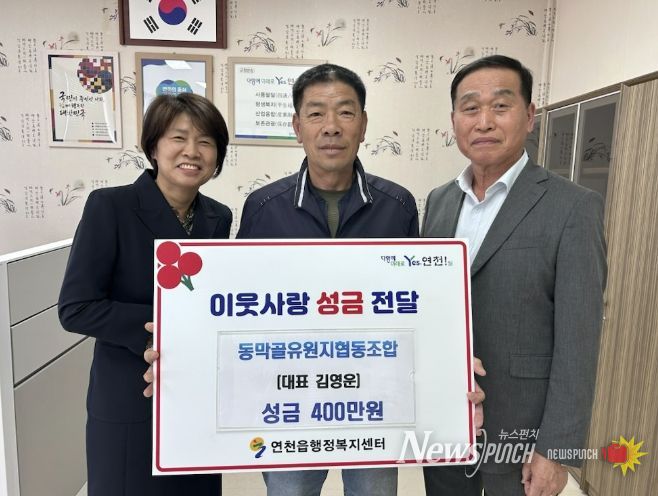 뉴스펀치 박상훈 기자 | 동막골유원지협동조합은 지난 28일 오후 4시 연천읍행정복지센터 읍장실에서 이웃돕기 후원 성금 400만 원을 기탁했다.