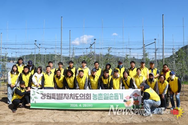뉴스펀치 조평훈 기자 | 강원특별자치도의회는 4월 29일(수) 화천군 사내면 일원 사과 농가를 찾아‘강원특별자치도의회 농촌일손돕기 봉사활동’을 실시했다.
