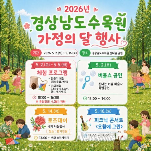 뉴스펀치 박세훈 기자 | 경상남도산림환경연구원은 가정의 달 5월을 맞아 오는 5월 2일부터 16일까지 경상남도수목원 잔디원 일원에서 가족 단위 방문객을 위한 체험·공연·나눔 행사를 운영한다고 밝혔다.