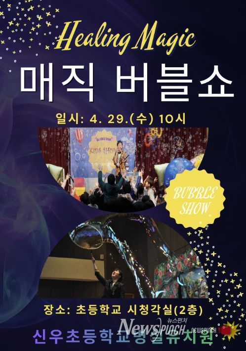 뉴스펀치 박상훈 기자 | 신우초등학교병설유치원은 4월 29일 교내 시청각실에서 ‘힐링 매직버블쇼’ 공연을 개최했다고 밝혔다. 이번 공연은 유아들이 직접 참여하며 즐길 수 있는 체험형 프로그램으로 마련됐다.