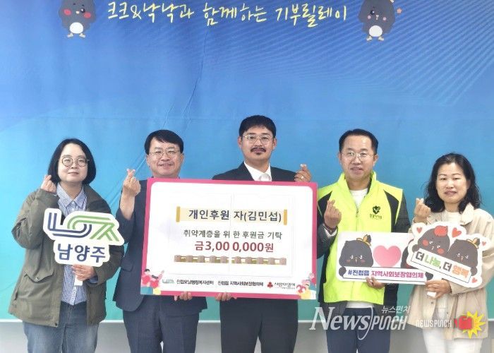 뉴스펀치 박상훈 기자 | 남양주시는 29일 진접오남행정복지센터에서 김민섭씨가 취약계층 지원을 위해 후원금 300만 원을 전달했다고 밝혔다.
