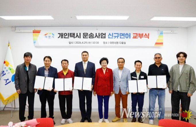 뉴스펀치 박상훈 기자 | 이천시는 29일 시청 다올실에서 개인택시운송사업 신규 면허증 교부식을 개최하고, 심사를 통해 최종 선정된 5명의 대상자에게 면허증을 전달했다고 밝혔다.