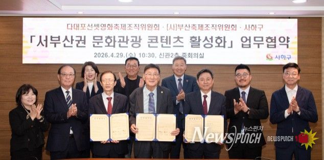 뉴스펀치 김윤걸 기자 | 부산 사하구는 서부산권에서 개최되는 축제 및 문화 행사를 중심으로 지역 문화관광 콘텐츠의 발전 가능성을 함께 모색하고 지속가능한 협력 기반을 마련하기 위해 4월 29일 다대포선셋영화축제조직위원회, 부산축제조직위원회와 업무협약을 체결했다고 밝혔다.