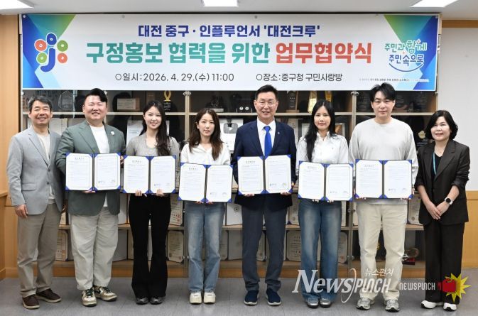 뉴스펀치 이현승 기자 | 대전 중구는 29일 중구청 구민사랑방에서 지역 기반 인플루언서 단체인 ‘대전크루’와 온라인 구정 홍보 활성화를 위한 업무협약을 체결했다고 밝혔다.