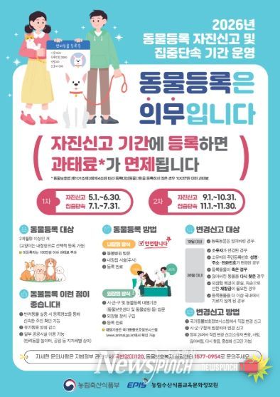 제주특별자치도는 성숙한 반려동물 문화 정착과 유기·유실동물 발생 예방을 위해 2026년도 동물등록 자진신고 기간을 연 2회 운영한다. 이 기간에는 미등록 및 변경사항 미신고에 대한 과태료가 면제된다.