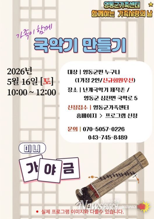 이번 프로그램은 오는 5월 16일 오전 10시부터 12시까지 심천면에 위치한 난계국악기제작촌에서 진행되며, 영동군민 10가정을 대상으로 운영된다.