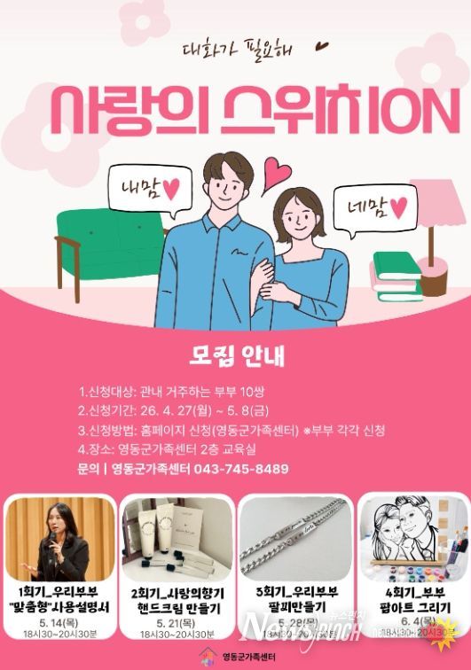 참여 신청은 5월 8일까지 영동군가족센터 홈페이지를 통해 가능하며, 부부가 각각 신청해야 한다.