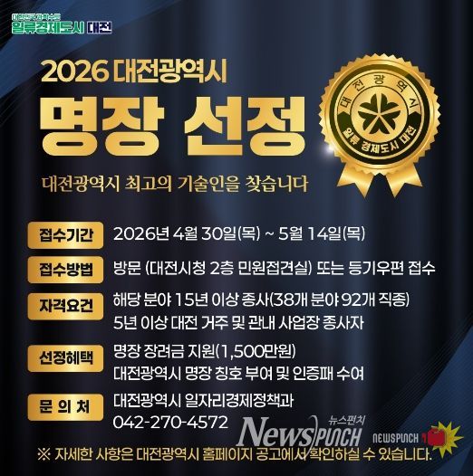 뉴스펀치 이현승 기자 | 대전시는 4월 30일부터 5월 14일까지 지역 숙련기술인의 자긍심을 높이고 산업 발전에 기여할 ‘2026 대전광역시 명장’을 공개 모집한다.