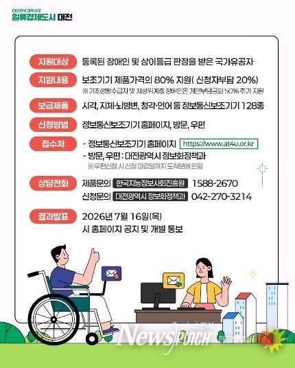 뉴스펀치 이현승 기자 | 대전시는 장애인의 디지털 정보 격차 해소와 삶의 질 향상을 위해 ‘2026년 정보통신보조기기 보급사업’을 추진하고, 약 200명에게 맞춤형 기기를 지원한다고 밝혔다.