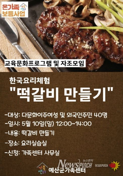뉴스펀치 이현승 기자 | 예산군가족센터는 지역 내 결혼이주여성과 외국인 주민의 한국문화 이해 증진과 안정적인 정착 지원을 위해 오는 5월 10일 한국전통요리 체험 ‘떡갈비 만들기’ 프로그램을 운영한다고 밝혔다.