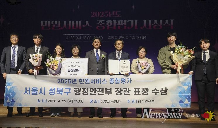 뉴스펀치 박상훈 기자 | 서울 성북구가 행정안전부와 국민권익위원회가 공동 주관한 ‘2025년 민원서비스 종합평가’에서 행정안전부 장관 표창을 수상하며 민원행정 우수 지자체로서의 위상을 다시 한 번 확인했다.