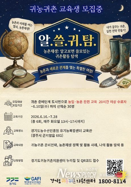 뉴스펀치 박상훈 기자 | 경기도농수산진흥원은 6월 10일까지 ‘농촌재생: 알고보면 쓸모있는 귀촌활동 탐색(알쓸귀탐)’ 교육생을 모집한다.