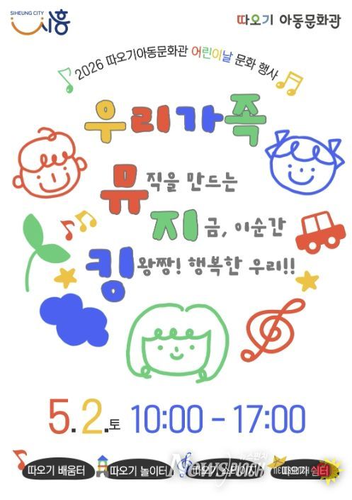 뉴스펀치 박상훈 기자 | 시흥시 따오기아동문화관은 어린이날을 맞아 오는 5월 2일 오전 10시부터 오후 5시까지 따오기아동문화관 야외 일대에서 2026년 어린이날 문화행사 ‘우리가족 뮤지킹’을 개최한다.