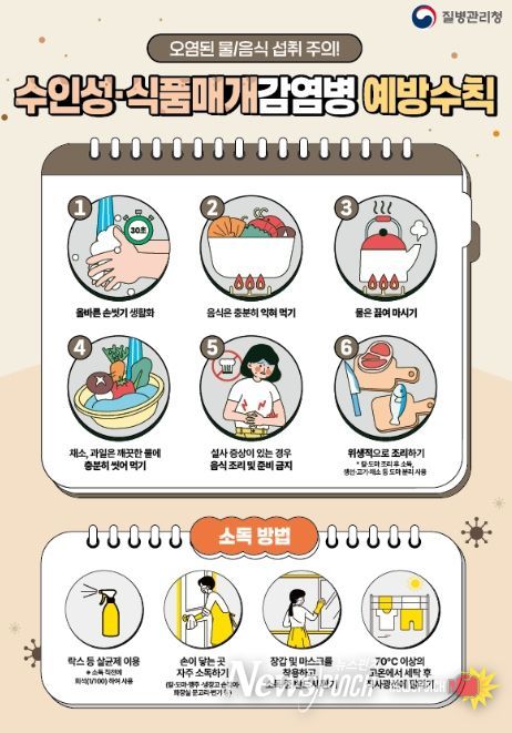 수인성ㆍ식품매개감염병은 병원성 세균, 바이러스, 원충에 오염된 물이나 식품을 섭취해 구토, 설사, 복통 등의 장관 증상을 유발한다. 이를 예방하기 위해서는 ▲올바른 손 씻기 생활화 ▲음식 충분히 익혀 먹기 ▲물 끓여 마시기 ▲채소ㆍ과일 깨끗한 물에 충분히 씻어 먹기 ▲설사 증상 시 음식 조리 및 준비 금지 ▲위생적으로 조리하기 등 예방수칙을 준수해야 한다.