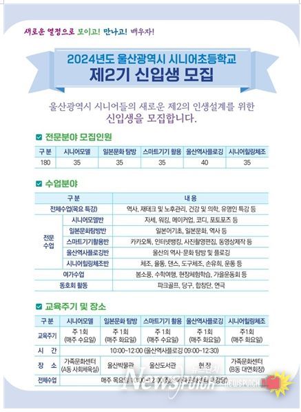 울산시 관계자는 “지난 2023년 3월 개교해 올해 2년째 접어든 ‘울산 시니어초등학교’를 통해 베이비 붐 세대 퇴직자 등 어르신들의 다양한 교육수요에 맞춘 새로운 삶의 원동력이 될 양질의 교육을 제공할 수 있도록 최선을 다하겠다.”라며 “많은 시민들의 관심과 참여를 당부드린다”라고 말했다.