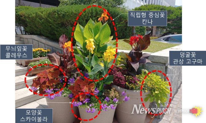 입체 화단은 화단 뒤쪽에 키가 크고 시원한 열대 느낌을 주는 칸나 등 ‘중심 꽃’을 배치하고 중앙부에는 꽃이 화려한 콜레우스 등 ‘모양 꽃’이나 모양 꽃을 받쳐주는 ‘무늬 잎 꽃’으로 꾸몄다. 앞쪽이나 가장자리에는 관상용 고구마 등 ‘덩굴 꽃’을 배치해 풍성한 느낌을 더했다.