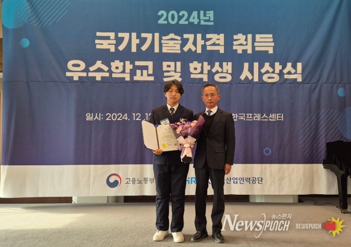 뉴스펀치 천세두 기자 | 제주도교육청 서귀포산업과학고등학교 통신전자과(군 특성화) 신연호 학생이 13일 고용노동부와 한국산업인력공단에서 주관한 전국 직업계고 재학생 가운데 국가기술자격 취득 우수학생으로 선정되어 한국산업인력공단 이사장상을 수상했다.