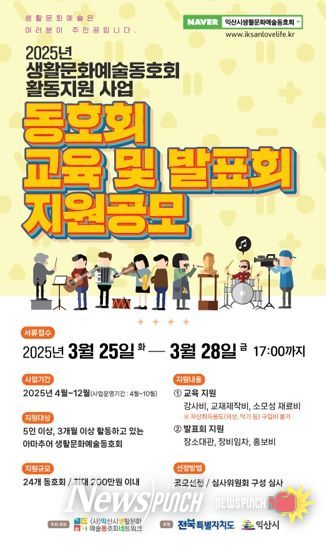 익산시는 ㈔익산시생활문화예술동호회네트워크가 오는 28일까지 '2025년 생활문화예술동호회 활동지원사업'에 참여할 동호회를 모집한다고 24일 밝혔다.