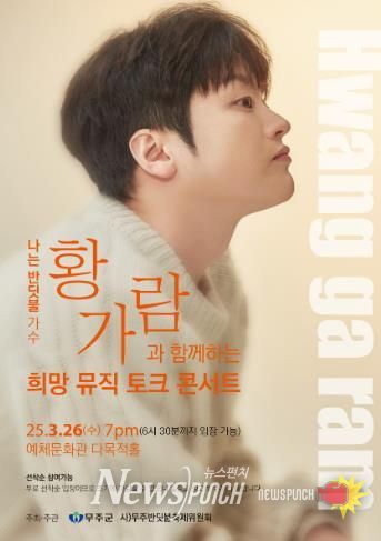 뉴스펀치 유동국 기자 | “나는 반딧불” 가수 황가람과 함께하는 희망 뮤직 토크 콘서트가 26일 저녁 7시 무주예체문화관 다목적홀(대공연장)에서 개최된다,
