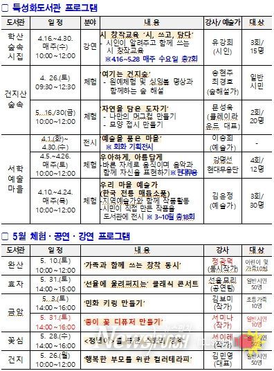 완산도서관은 오는 5월 10일 정광덕 동시작가와 함께하는 ‘가족과 함께 쓰는 창작 동시’ 체험 프로그램을 운영하고, 효자도서관은 오는 5월 31일 선율모리 공연팀의 살롱드국악 ‘선율에 울려퍼지는’을 주제로 하는 온가족이 함께 즐기는 클래식 인문학 콘서트를 만나볼 수 있다.