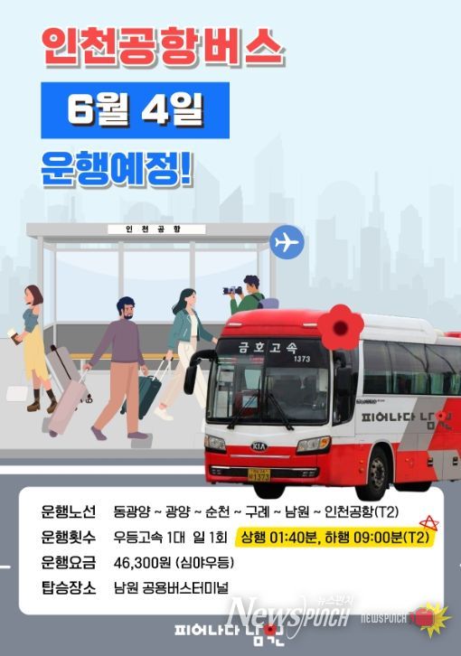 뉴스펀치 정홍균 기자 | 남원시는 2025년 6월 4일부터 남원에서 인천공항을 오가는 공항버스노선 운행을 재개한다고 밝혔다.