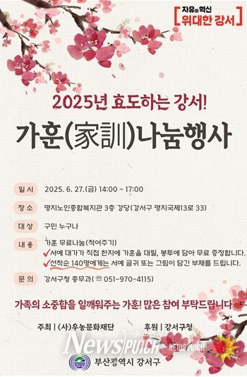 뉴스펀치 김길룡 기자 | 부산 강서구는 오는 6월 27일, 명지노인종합복지관 3층 강당에서 ‘2025년 효도하는 강서! 가훈 나눔 행사’를 개최한다고 밝혔다.
