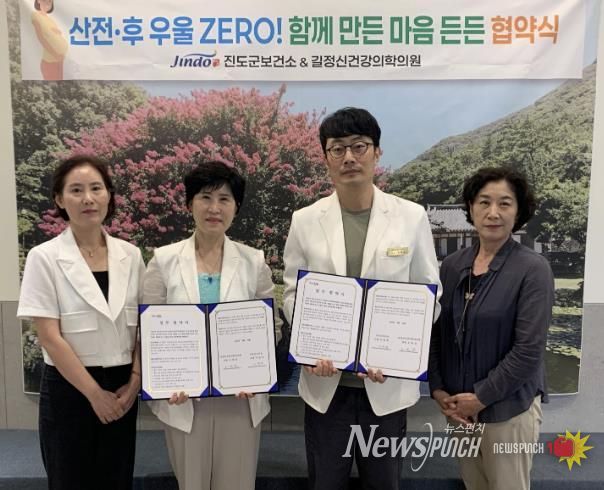 뉴스펀치 손석남 기자 | 진도군 보건소는 최근, 출산 가정의 심리적 어려움을 조기에 발견하고 맞춤형 연계를 강화하기 위해 길정신건강의학의원과 ‘산전·후 우울 제로(ZERO)! 함께만든 마음든든 협약’을 체결했다고 밝혔다.