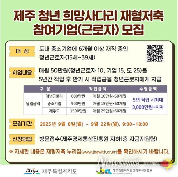 뉴스펀치 천세두 기자 | 제주특별자치도와 제주특별자치도경제통상진흥원(이하 진흥원)은 도내 청년근로자의 자산형성을 지원하기 위한‘제주 청년 희망사다리 재형저축’사업의 참여자를 오는 9월 22일까지 추가 모집한다고 밝혔다.