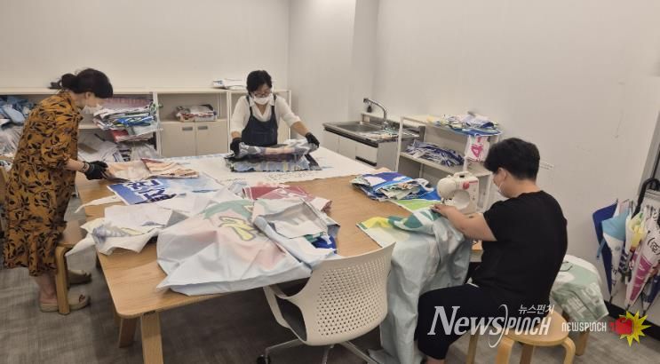 옥주골 창작소는 지난 6월에 진도군 옥외광고협회와 연계해 폐현수막을 수거했고, 7월에는 세척과 건조 등 전처리 과정을 거친 폐현수막을 활용하여 디자인 작업 후 대형 마대, 줍줍 주머니, 화폭(캔버스) 등을 제작했다.
