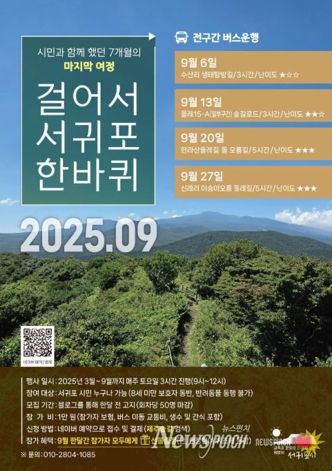 뉴스펀치 천세두 기자 | 서귀포시는 건강한 걷기문화 확산과 시민 건강증진을 위해 운영 중인 ‘걸어서 서귀포 한바퀴’ 프로그램이 오는 9월 27일 마지막 일정을 앞두고, 누적 1,000여 명이 참여하며 큰 호응을 얻고 있다고 밝혔다.