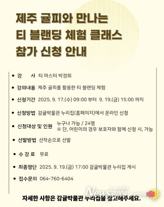 전익현 서귀포시 관광지관리소장은 “이번 가을 강좌를 통해 제주 감귤의 문화적 가치를 재발견하고, 차와 명상을 통한 심리적 회복의 시간을 시민과 관광객 모두에게 제공하길 기대한다”고 전했다.