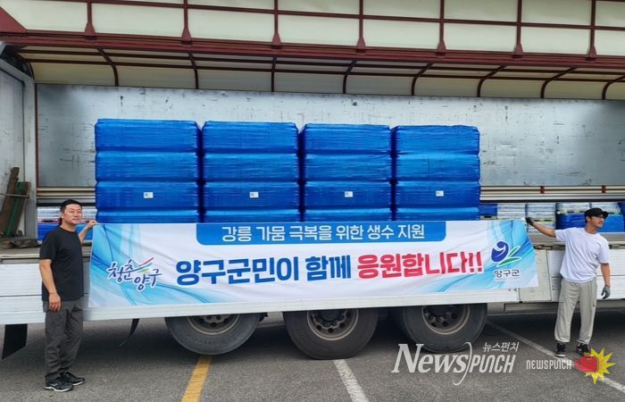 뉴스펀치 김보성 기자 | 양구군은 유례없는 가뭄으로 일상 생활에 어려움을 겪고 있는 강릉시에 지난 12일 생수를 긴급 지원했다. 강릉시는 극심한 가뭄으로 지난달 30일 재난사태가 선포됐으며, 식수원 고갈로 인해 제한 급수가 시행되고 있다.