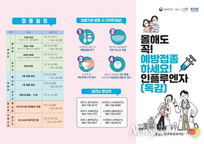 뉴스펀치 천세두 기자 | 제주시는 오는 9월 22일부터 내년 4월 30일까지 2025-2026절기 인플루엔자(독감) 무료 예방접종을 지정의료기관에서 실시한다고 밝혔다.