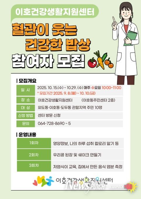 뉴스펀치 천세두 기자 | 제주시 이호건강생활지원센터는 외도·이호·도두동 주민을 대상으로 심뇌혈관질환 예방을 위한 영양 교육 프로그램 ‘혈관이 웃는 건강한 밥상’을 오는 10월부터 운영한다.