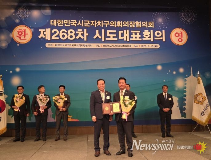 뉴스펀치 김종율 기자 | 예천군의회 강영구 의장은 16일, 경주에서 개최된 대한민국 시·군자치구의회의장협의회 제268차 시·도 대표회의에서 ‘의정봉사상’을 수상했다.