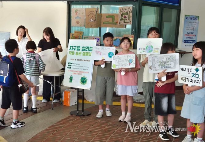 뉴스펀치 천세두 기자 | 제주도교육청 동화초등학교는 15일 아침 등굣길에 전교어린이회와 학부모환경동아리 동화그린(GREEN)이 주관한 ‘지구를 살리는 작은 습관’ 환경사랑 캠페인을 운영했다.