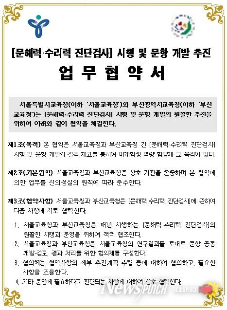 뉴스펀치 김완규 기자 | 서울특별시교육청과 부산광역시교육청은 2025년 9월 18일, 학생들의 핵심역량 강화를 위한 ‘문해력·수리력 진단검사 개발 및 운영’에 상호 협력하는 업무협약을 체결한다.