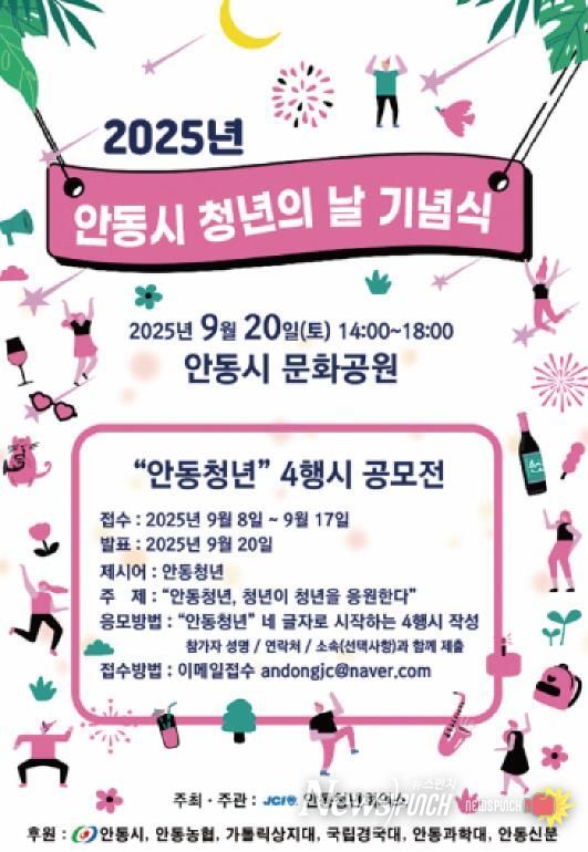 뉴스펀치 김종율 기자 | 안동시와 안동청년회의소는 오는 9월 20일 '2025년 안동시 청년의 날 기념식'을 안동시 문화공원에서 개최한다. 이번 행사는 청년의 날을 기념하며, 청년들이 함께 소통하고 교류하며 참여할 수 있는 네트워킹의 장을 제공하기 위해 마련됐다.