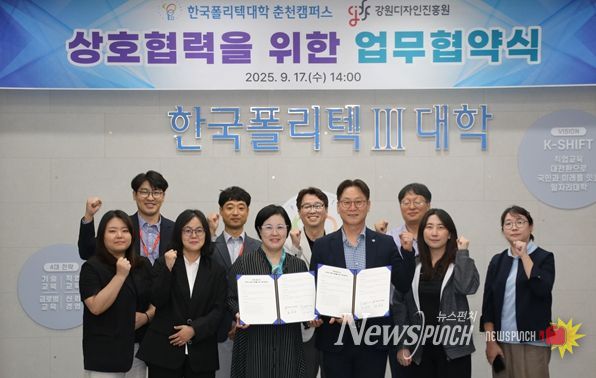 뉴스펀치 김보성 기자 | 강원디자인진흥원은 9월 17일 한국폴리텍Ⅲ대학 춘천캠퍼스(학장 지경배, ‘한국폴리텍Ⅲ대학’)과 디자인산업 발전과 지역 인재 양성 상호협력을 위한 업무협약을 체결했다.
