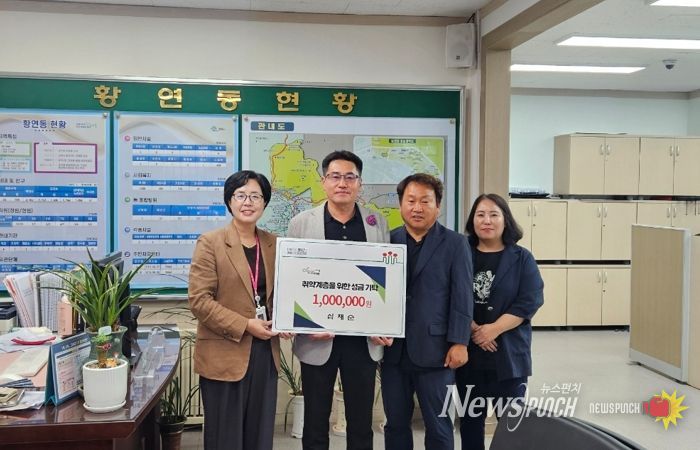 뉴스펀치 김보성 기자 | 황연동행정복지센터는 태백시 공공사업과장으로 재직 중인 심재순 씨가 지난 17일 황연동행정복지센터를 방문해 관내 취약계층을 위해 사용해 달라며 성금 100만 원을 전달했다고 밝혔다.