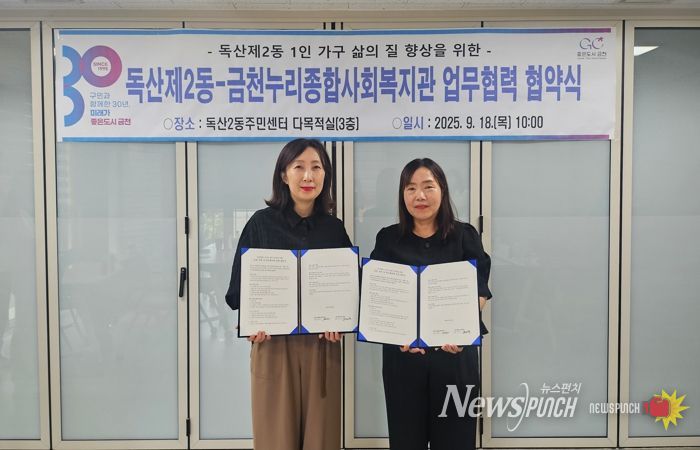 뉴스펀치 김완규 기자 | 금천구는 지난 18일 독산제2동주민센터와 금천누리종합사회복지관이 관내 사회적 고립 1인 가구의 삶의 질 향상을 위해 업무협약을 체결했다고 밝혔다.