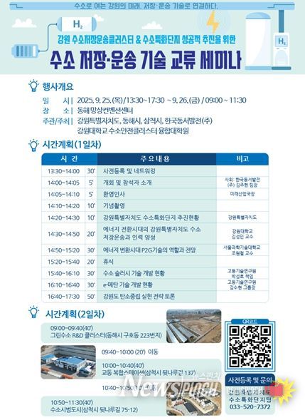뉴스펀치 김보성 기자 | 강원특별자치도는 9월 25일부터 26일까지 동해 망상컨벤션센터와 동해·삼척 일원에서 '수소 저장·운송 기술 교류 세미나'를 개최한다고 밝혔다.