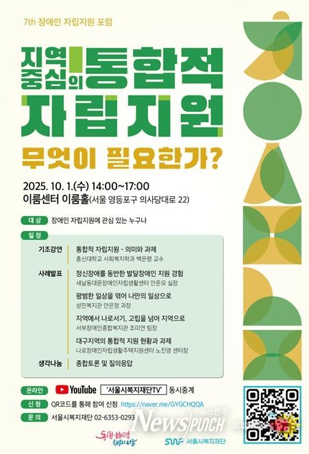 뉴스펀치 김완규 기자 | 서울시복지재단은 오는 10월 1일 오후 2시, 서울 영등포구 이룸센터 이룸홀에서 개최되는 '제7차 장애인 자립지원 포럼' 참여자를 모집한다고 밝혔다.