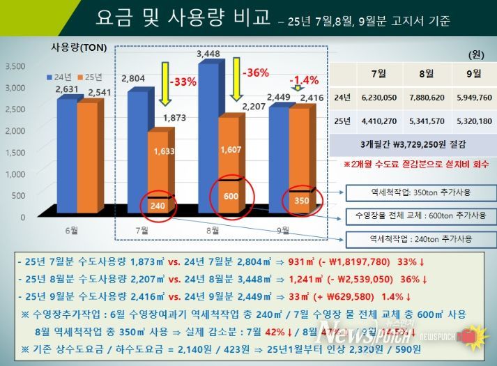 성과 분석 결과, 7월 수도 사용량은 전년 동월 대비 33%(931㎥) 절감, 8월은 36%(1,241㎥) 절감됐다.