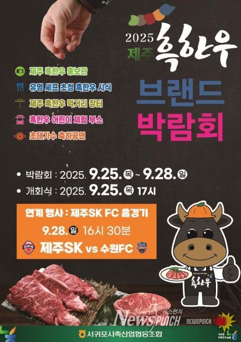 뉴스펀치 천세두 기자 | 서귀포시는 추석 명절을 앞두고 제주 흑한우의 가치를 널리 알리고, 소비촉진을 통해 지역 축산업과 경제 활성화에 기여하고자 오는 9월 25일부터 9월 28일까지 4일간 제주월드컵경기장 광장에서 ‘2025 제주 흑한우 브랜드 박람회’를 개최한다고 밝혔다.