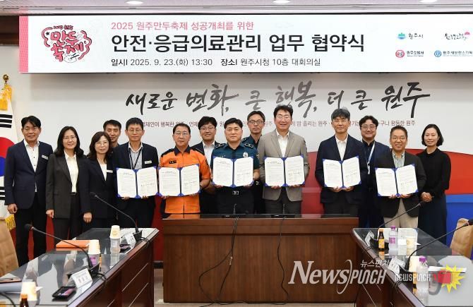 뉴스펀치 김보성 기자 | 원주시는 ‘2025 원주만두축제’의 안전하고 성공적인 개최를 위해 지난 23일 원주경찰서, 원주소방서, 원주세브란스기독병원, 성지병원과 함께 안전·응급의료관리 업무협약을 체결했다.