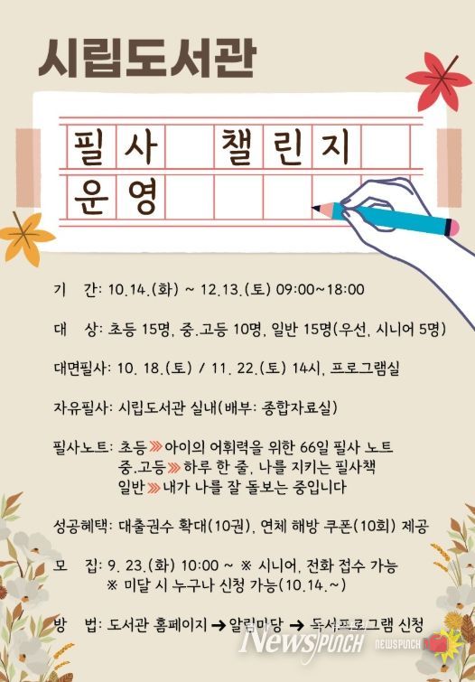 뉴스펀치 김보성 기자 | 태백시는 태백시립도서관에서 오는 10월 14일부터 12월 13일까지(운영시간 09:00~18:00) ‘필사 챌린지’를 운영한다고 밝혔다.