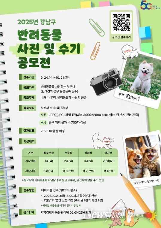 뉴스펀치 김완규 기자 | 꿈이 모이는 도시, 미래를 그리는 강남구가 오는 9월 24일부터 10월 21일까지 ‘반려동물 사진 및 수기 공모전’을 개최한다. 이번 공모전은 반려동물과 함께한 일상을 기록한 사진과 수기를 접수받아 총상금 190만 원 규모로 시상할 예정이다.